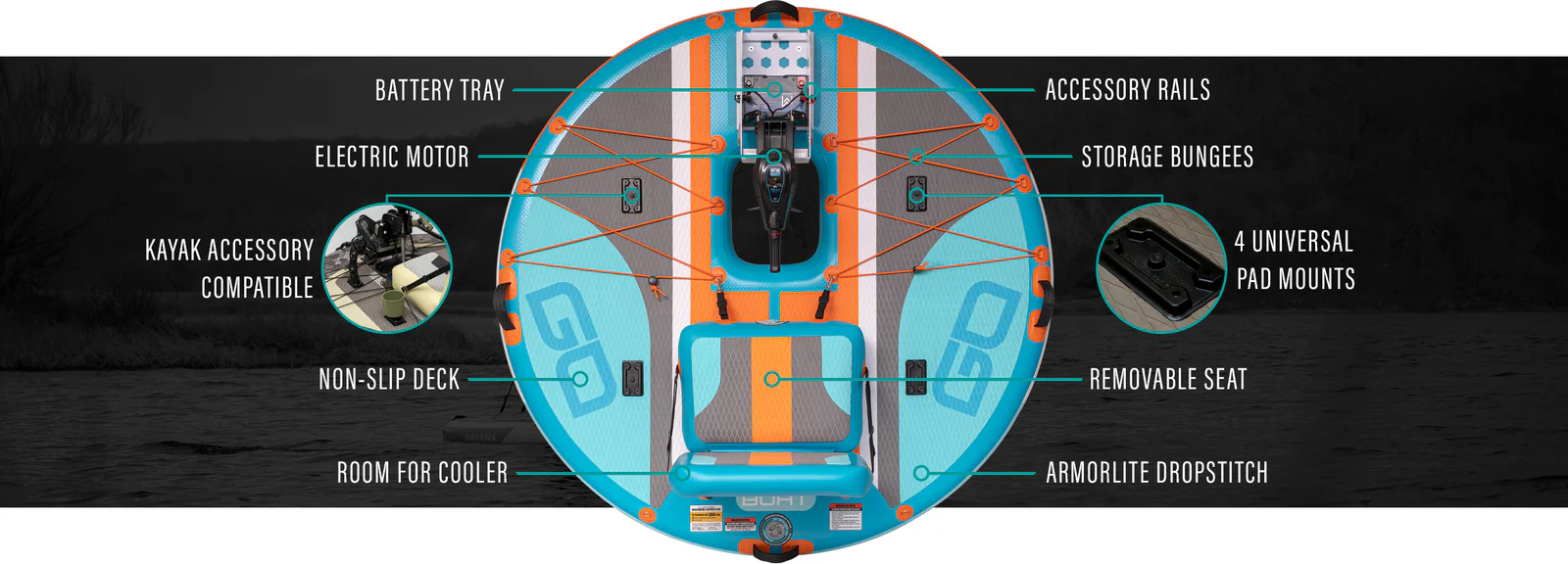 Glide around the intracoastal waterway, serene lakes, and race down rivers, or enjoy bumper boat battles with friends. With plenty of storage and quick maneuverability, the Fish model is perfect for family fun, fishing, and exploration alike. Cruise at 5 mph discovering hidden coves and secret spots while enjoying the stability created from round boats. When the adventure ends simply deflate and store it in your vehicle for the next exciting outing!